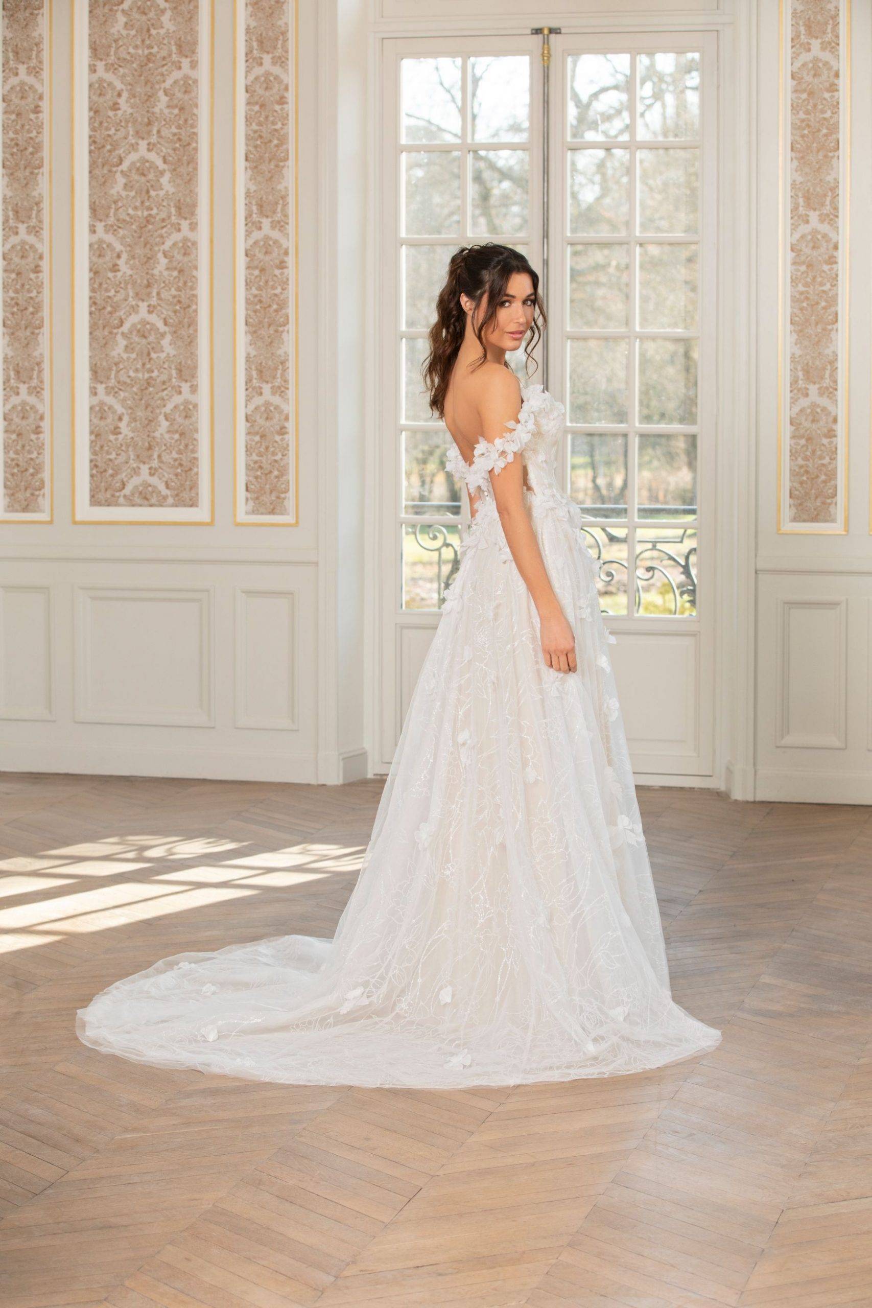 Nairi, ou la robe romantique par excellence. Une dentelle fleurie, une couleur légèment rosée, et des bretelles tombantes pour une touche de glamour.